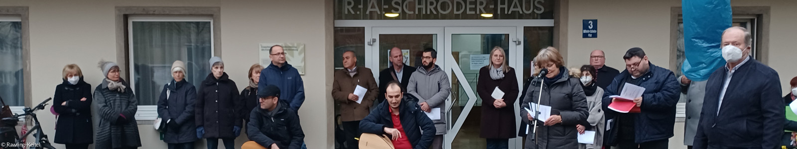 Einem Aufruf des Interreligiösen Gesprächskreises waren (am 31.3.) Gläubige verschiedener Religionen gefolgt. Im unfreundlichen Wetter fanden die Gebete auf dem Platz der Versöhnung vor der St. Stephanskirche statt. Musikalisch wurde die Feier umrahmt von Hussein und Hassan Mahmoud. Einleitend wies Pfarrerin Susanne Wildfeuer darauf hin, dass das Denkmal der Versöhnung 20 Jahre alt ist. Bereits 2002 wurde auch die Gedenkplatte für Russland verlegt, damals gemeinsam mit jüdischen Kontingentflüchtlingen vom Heuchelhof. Sie konnte von den Religionen den katholischen Dekan Stefan Gessner begrüßen und richtete ein Grußwort vom evangelischen Dekan Dr. Wenrich Slenczka aus. Für die muslimischen Gemeinden war der Sprecher Ahmed Bastürk anwesend. Die jüdische Gemeinde wurde durch Alexander Shif vertreten. Außerdem waren Mitglieder der Baha’i – Gemeinde und des Sozialen Buddhismus anwesend. Von Seiten der Stadt richtete Stadtrat Antonino Peccararo, der Vorsitzende des Ausländer- und Integrationsbeirats ein Grußwort an die Versammelten. Norbert Klaes erläuterte die schwierige religiöse Situation in der heutigen Ukraine. Juden, Christen und Muslime, also Religionen, die sich auf Abraham beziehen, sprachen ein gemeinsames Gebet, wie das vor einem Jahr im Irak von Papst Franziskus in der antiken Stadt Ur, dem Herkunftsort von Abraham, geschehen war. Aus buddhistischer Tradition stammte die Vision, dass auf diesem Erdball automatisch Weltfrieden herrschte, wenn der Geist aller fühlenden Wesen dieser Welt an einem Ort zusammenkäme. Dies wäre für alle zusammen ein glückliches Leben. Die Bitte, dass Gott allen Menschen einen neuen Geist verleihe, die Tore wahren Verstehens öffne und ihnen ewiges Leben schenke, wurde von den Baha’i vorgebracht. Die Muslime missbilligten gemeinsam die Friedensbrüche und Ungerechtigkeiten überall, wo es sie auf der Welt gebe. An Allah wurde die Bitte um Mut gerichtet, um Zivilcourage zu üben und die Ungerechtigkeiten zu besiegen: „Oh Allah, lehre uns, dass Toleranz der höchste Grad von Stärke, und das Bedürfnis nach Rache das erste Zeichen von Schwäche ist!“ Auf Hebräisch erklangen die Worte. "Und das Volk soll sich nicht erheben. Die Menschen werden nicht mehr mit dem Schwert kämpfen, und sie werden nicht mehr lernen zu kämpfen." Für die Suchenden, die Nicht-religiös-Gebundenen standen die Worte: „Und wenn uns Ängste und Zweifel bedrängen, entscheiden wir uns, zu vertrauen, dass du uns stärkst, großes Geheimnis, denn du willst, dass wir sind, dass wir leben und streben und Frieden bewirken.“ Mit einem Kerzenritual und einem Segen schloss die Besinnungsfeier: „Die kleine Flamme einer Kerze kann die Welt hell machen. Wie das Licht einer Kerze soll der Frieden weitergeben werden. Von mir zu dir. Von hier hinaus in die Welt.“