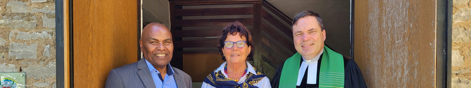 V.l.n.r. Ahmed Mohammed aus Äthiopien, DAHW-Pastpräsidentin Gudrun Freifrau von Wiedersperg und Pfarrer Niko Natzschka
