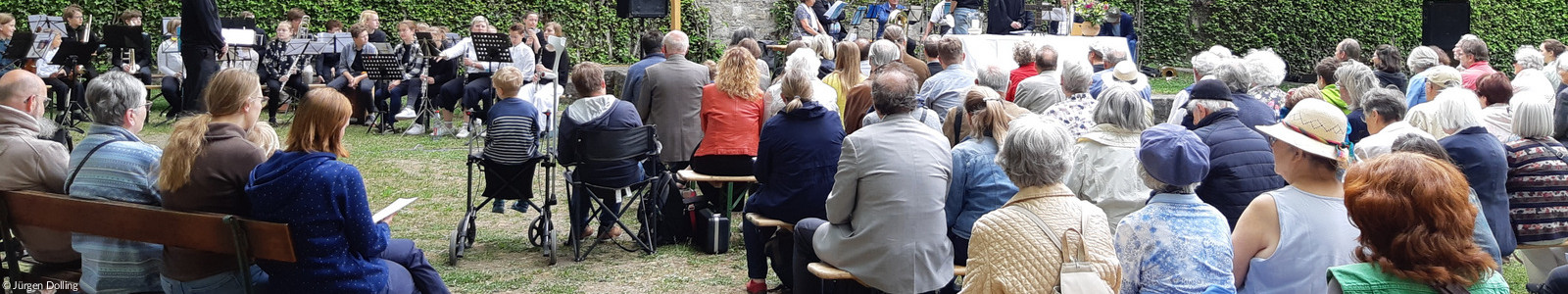 Am 26.5. war Himmelfahrtsgottesdienst im Residenzgarten mit über 200 Personen. Die Kirchengemeinden St. Johannis, St. Stephan und die methodistische Gemeinde feierten diesen miteinander. Die Dekanatsmusikschule und der CVJM-Posaunenchor haben dazu musiziert. Danach gab es einen Frühschoppen im Dekanatsgarten, passend zum Thema von oben betrachtet.