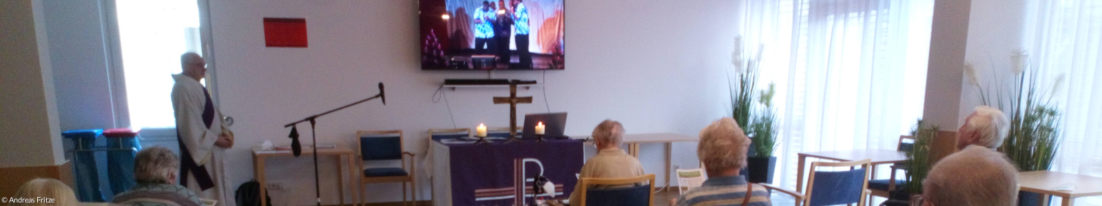 Das Foto zeigt einen der 3 Gottesdienste, die im Wohnstift St. Paul gefeiert wurden (für jeden Wohnbereich einen).